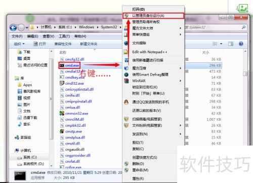 4、 首先,进入系统安装目录下的WindowsSystem32文件夹,找到其中的cmd.exe文件,这就是命令提示符的主程序。右键点击该文件,选择以管理员身份运行,即可打开具有管理员权限的命令提示符窗口,操作过程所示。