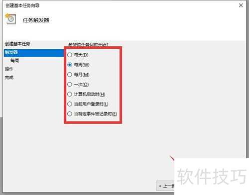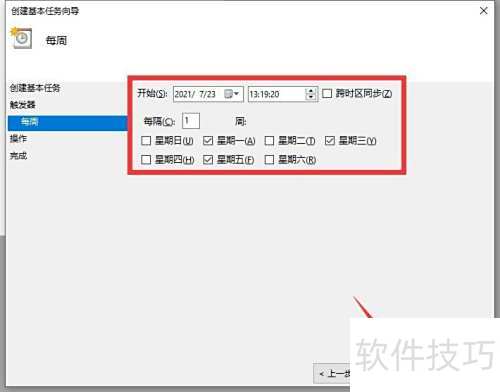 5、 根据先前选择,可对任务执行时间进行详细设定。由于任务为每周运行,此处可具体指定执行的星期及时间。