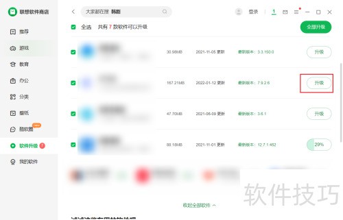 3、 选择需升级的软件,确认升级文件大小,最后点击升级按钮完成操作。