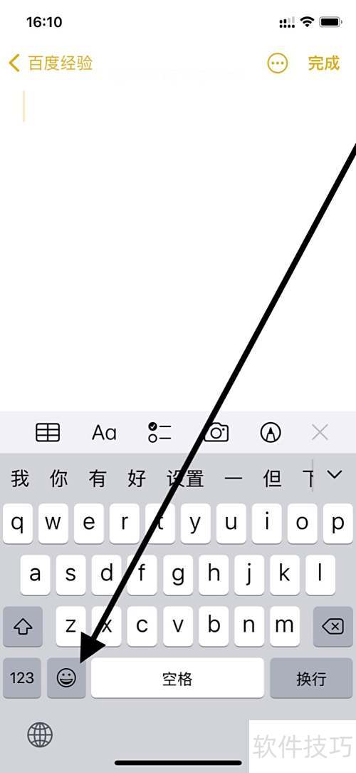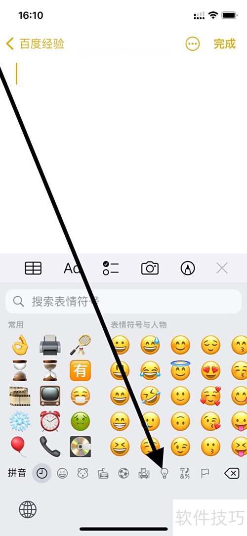 在iPhone上打开键盘表情符号页面,找到并点击软盘图标即可输入。