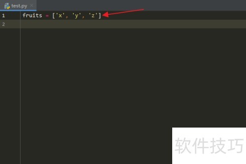 3、 在Python代码编辑区域,键入fruits = 这一语句。