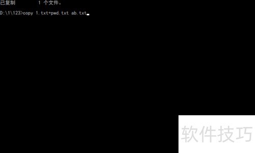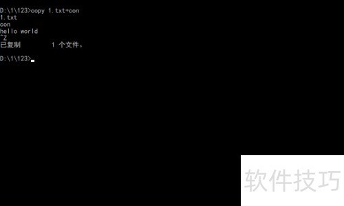 20、 输入命令copy 1.txt+con以合并文件内容。