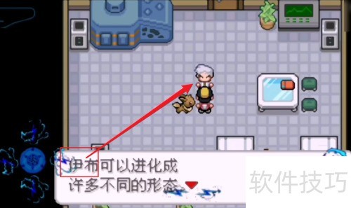 3、 所示,按任务指引前往实验室,与对话后即可领取初始宝可梦。