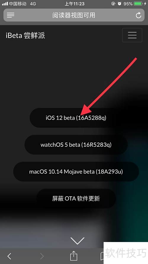 1、 打开指定网址,进入网页界面后,找到并点击iOS 12 beta(...