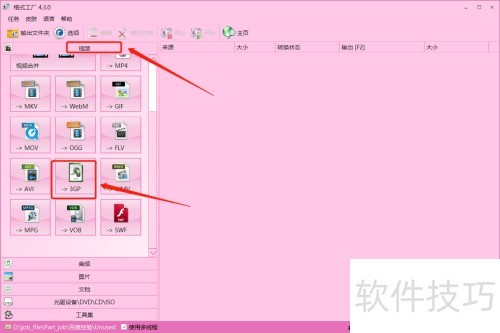 2、 在手机上启动格式工厂,进入主界面后点击视频选项,接着在视频功能列表中选择转3GP,系统将自动跳转至3GP格式转换的参数设置页面。