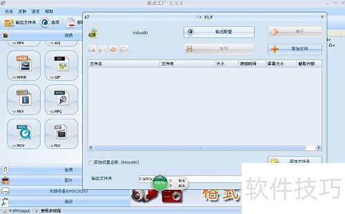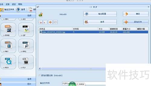2、 打开格式工厂后,选择左侧目标格式,如将3gp转为flv,点击flv选项。进入页面后,点击右上角添加文件并确认。底部可设置输出文件夹,按需修改保存路径即可完成配置。