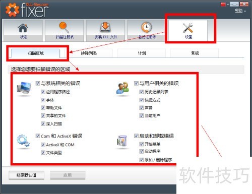 2、 进入设置选项卡,在扫描区域中选择需要DLL-files Fixer扫描的项目并勾选即可。