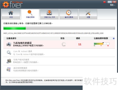 3、 软件默认会检测四类错误:系统相关错误、Com与ActiveX错误、用户相关错误,以及安装和卸载过程中的错误。由于涉及范围较广,整个扫描过程通常需要较长时间才能完成。