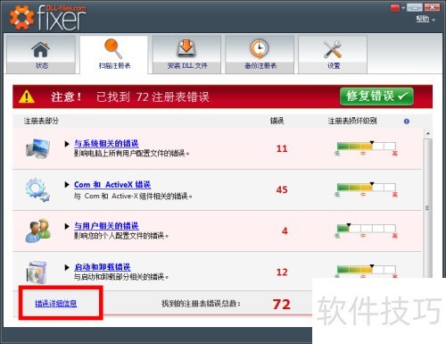4、 扫描完成后,点击错误详细信息查看检测结果,确认无误后,点击修复错误按钮即可开始修复。