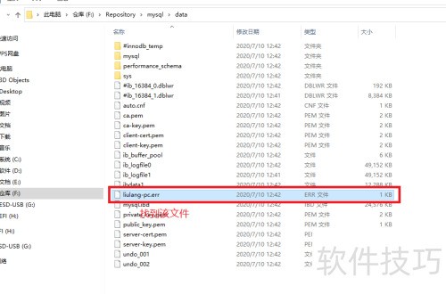 9、 初始化完成后,进入我们设定的数据目录。由于配置文件中已指定路径为F:/Repository/mysql/data,因此直接打开此文件夹。此时可看到系统已生成MySQL初始化所需的数据库文件。接着,在该目录中查找一个以计算机名称命名,并以.err为扩展名的日志文件,该文件通常记录了运行过程中的错误信息。