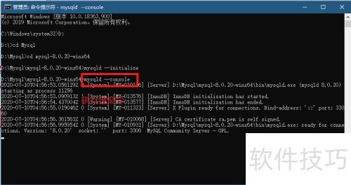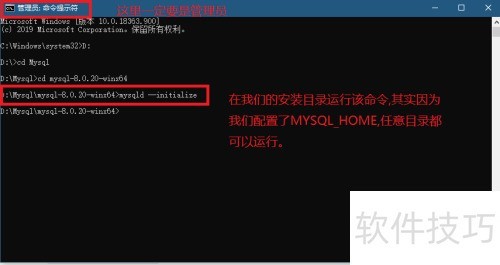 8、 以管理员权限启动命令提示符,切换到MySQL安装路径,执行mysqld --initialize命令,完成数据目录的初始化操作。