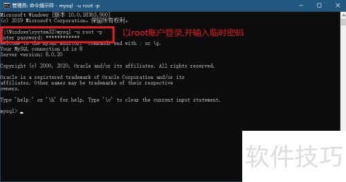 11、 以管理员身份打开命令提示符窗口,登录MySQL,输入命令mysql -u root -p,随后键入初始临时密码完成登录操作。
