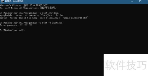 13、 以管理员身份打开命令窗口,输入mysqladmin -u root -p shutdown命令,随后输入修改后的密码,即可成功停止MySQL服务。服务停止后,原来运行MySQL的窗口也可安全关闭。操作完成后无需保留任何命令行界面。