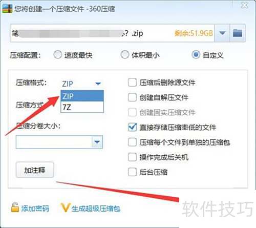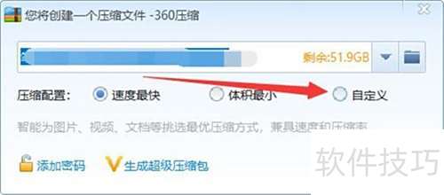 2、 在弹出的创建压缩文件窗口中,选择自定义选项。