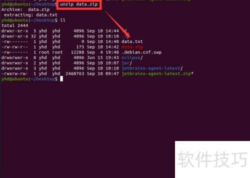 6、 第六步,通过unzip命令解压data.zip,检查桌面上是否生成了新的data.txt文件。