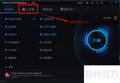 1、 进入Advanced SystemCare主界面后,点击工具箱选项,其中集成了多种实用功能,便于用户进行系统优化与维护操作。