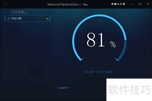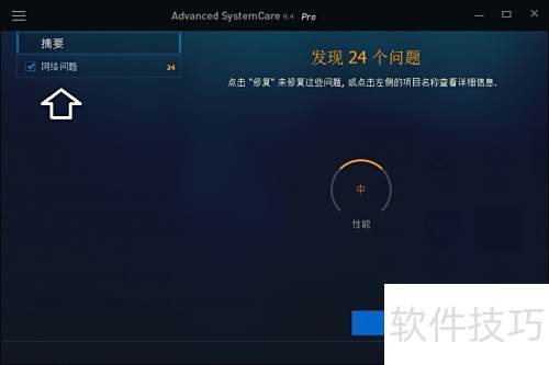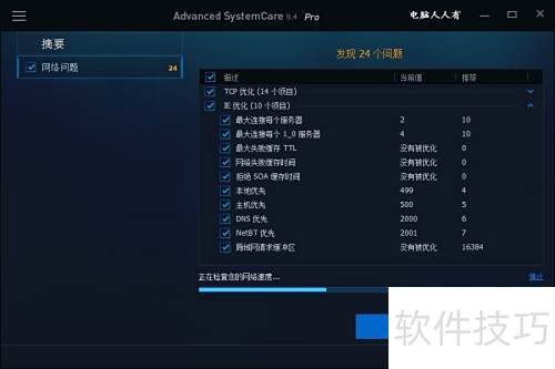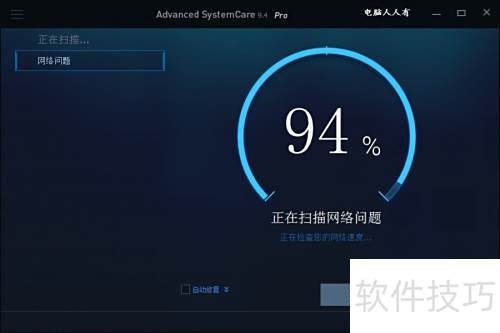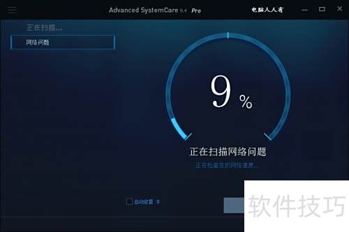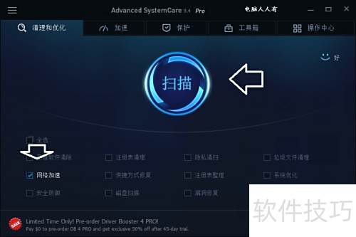 2、 打开Advanced SystemCare软件,选择网络加速功能(首次可单独检测以测试实际效果),然后开始扫描。