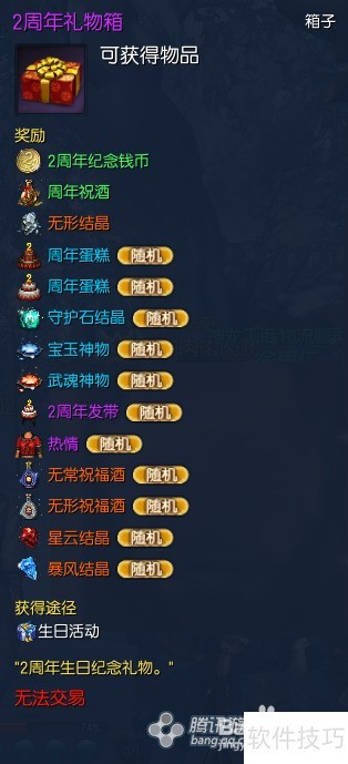 2、 在剑灵两周年期间,玩家可通过开启游戏内的纪念礼盒获取1至3枚纪念币,每人具体数量随机,图示为开出两枚的情况。