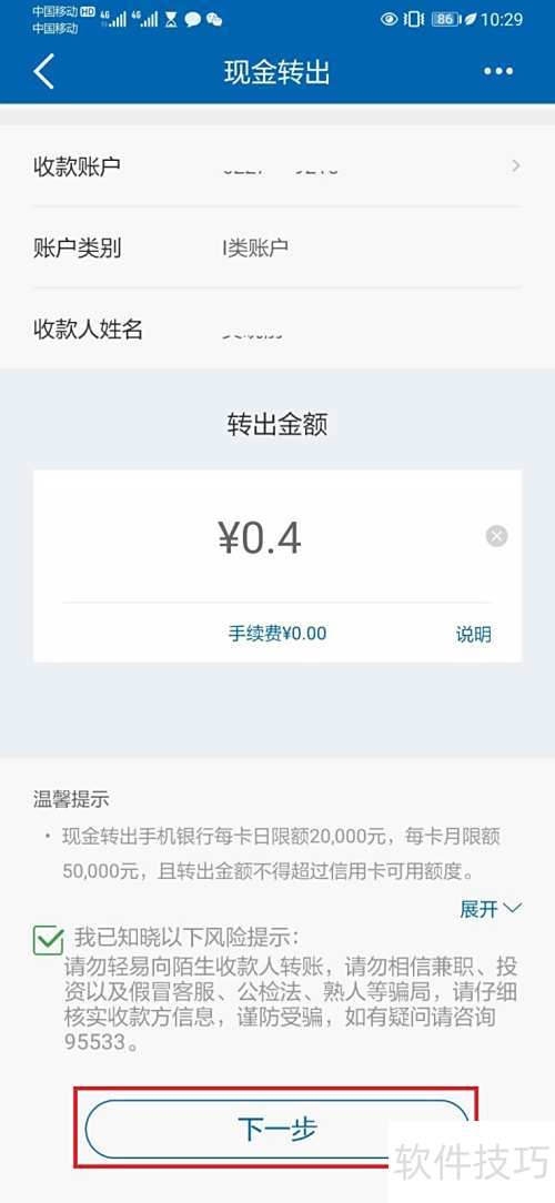 3、 进入现金转出页面,选定转出账户,填写金额后点击下一步即可完成操作。