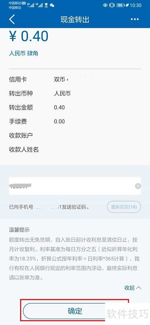 4、 在确认现金转出页面,输入短信验证码后点击确定即可完成操作。