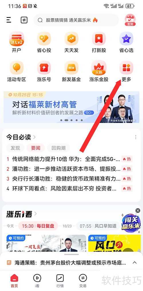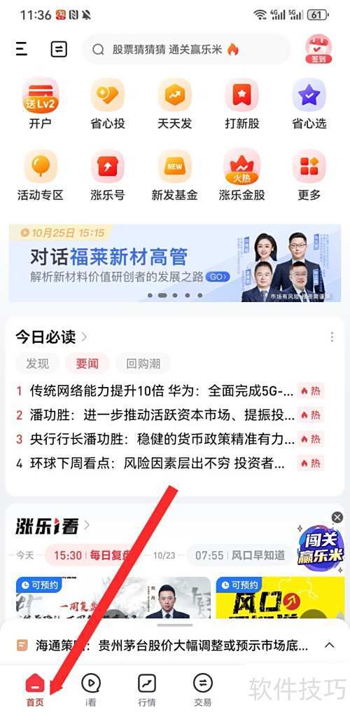 1、 打开涨乐财付通应用,点击首页进入主界面。