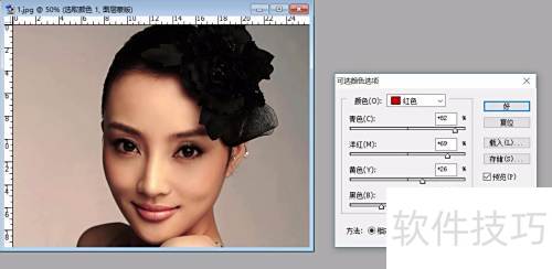 4、 可选颜色。调整照片中的红色,使人像肤色更显健康红润,提升整体视觉效果。