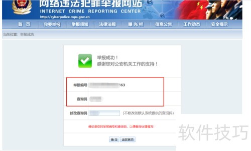 5、 提交成功后,系统将返回此页面,显示本次举报的查询码与举报编码。您可通过第二步中的举报查询按钮,进入相应页面查看举报处理进度。