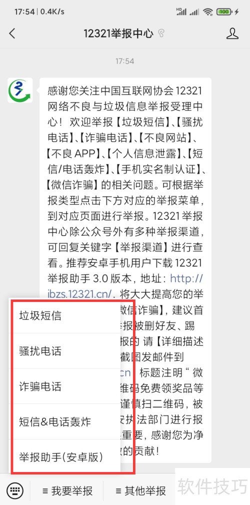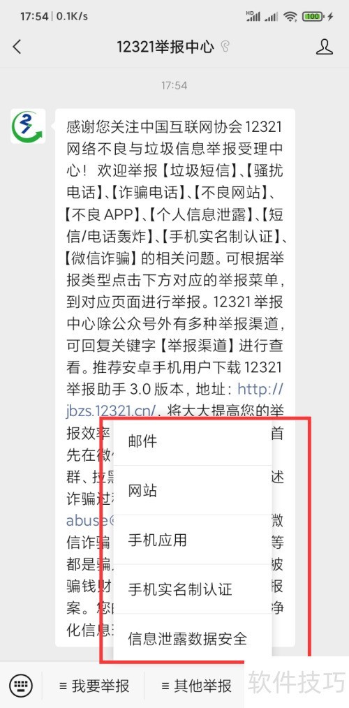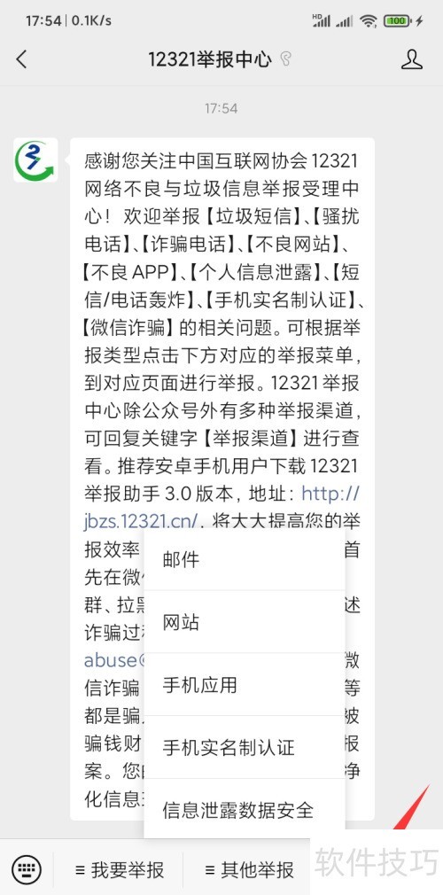 2、 通过公众号菜单可选择不同方式举报,针对诈骗应用或网站进行分类提交。