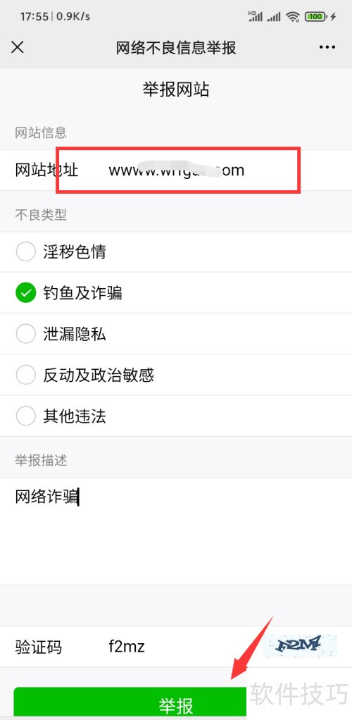 4、 访问诈骗网站,选择相应类型,输入验证码后点击举报即可完成操作。