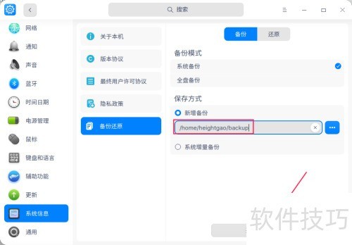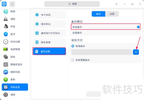 2、 若在安装UOS时选择了全盘安装,可在备份还原功能中选择系统备份,并通过浏览按钮指定备份文件的存储位置。