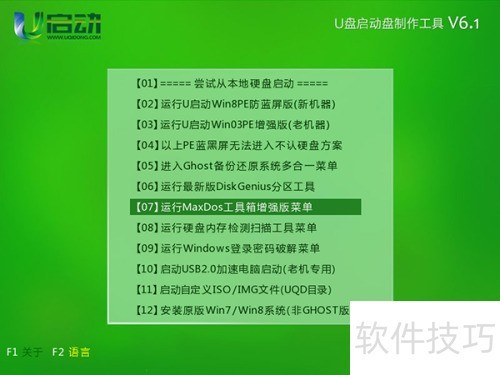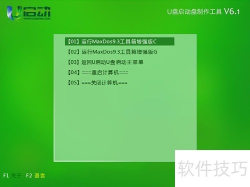 1、 制作U启动U盘启动盘时,可参照U启动V6.1一键U盘启动制作使用教程。将制作完成的U盘插入电脑USB接口,重启计算机。当开机画面出现时,通过一键启动快捷键进入U启动主菜单界面,选择运行MaxDOS工具箱增强版选项,按下回车键即可执行操作,具体界面所示。