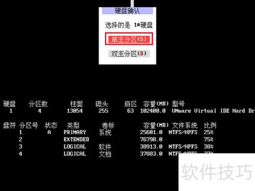 7、 处理完硬盘信息后,将显示其基本参数。若存在多个硬盘,需先选定一个,然后点击选择单个主分区,操作所示。