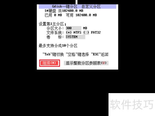 9、 首先配置首个分区的基础信息,包括分区大小、文件系统类型和卷标名称,设置完毕后点击继续按钮,具体操作所示。