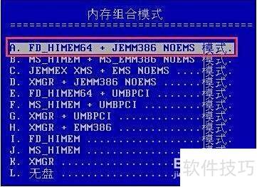2、 在内存组合模式窗口内,选择A.FD-HIMEM64 + JEMM386 NOEMS模式,具体操作所示。
