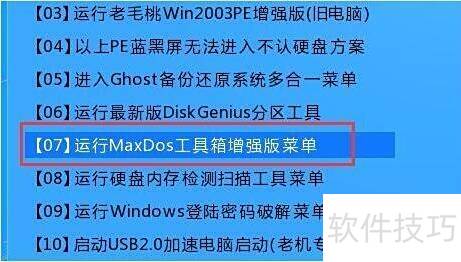 1、 将已制作好的老毛桃U盘插入电脑的USB接口,启动计算机。按下对应的启动快捷键,进入老毛桃主菜单界面。使用键盘方向键↓选择运行MaxDos工具箱增强版菜单,按回车键确认进入,操作界面所示。
