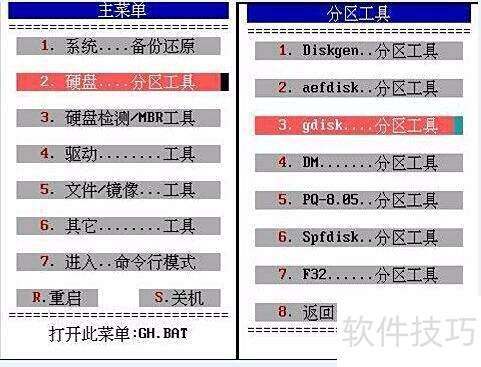 3、 在主菜单中,选择2.硬盘...分区工具并按回车进入,随后切换至3.gdisk...分区工具,操作界面所示。