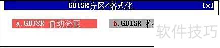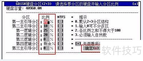 4、 在提示框中选择a.GDISK 自动分区,进入硬盘分区界面,调整所需分区比例后,点击确定完成操作,所示。