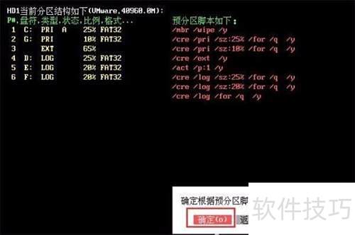 5、 按回车确认后,系统将依据预设分区脚本对硬盘进行划分,随后显示分区进度,具体所示。