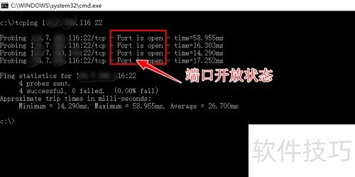 4、 通过tcping工具检测目标主机22端口的开放状态及响应情况。