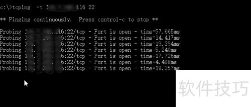 12、 若要检测IPv6地址的主机,可使用-6参数;进行长时间ping测试时,可添加-t参数;在tcping命令后指定主机端口号,即可对目标端口执行连接测试。