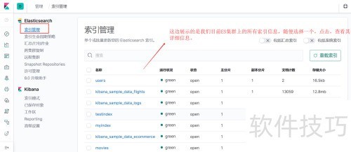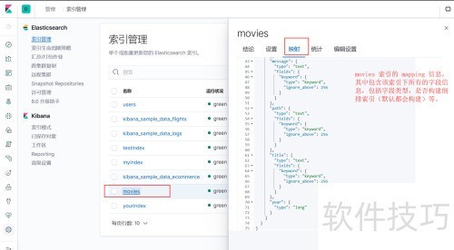 2、 登录 Kibana 管理界面,进入索引管理,任选一个索引并点击打开,在弹出窗口中切换至映射标签页,即可查看该索引的 Mapping 结构信息。
