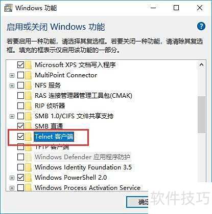1、 Telnet采用客户端/服务器模式运行,使用前需先在客户端主机启用此功能。Windows 10系统默认未开启,用户可通过控制面板中的程序和功能选项,选择启用或关闭Windows功能,在弹出窗口中勾选Telnet客户端以完成启用。