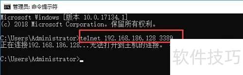 5、 以测试3389端口连通性为例说明服务器配置。在未开启远程桌面功能时,于客户端的命令提示符窗口执行telnet ip 端口号命令,系统将提示无法打开到主机的连接,在端口3389连接失败,表明该端口当前无法建立连接,验证了服务未启用状态下的端口封闭情况。
