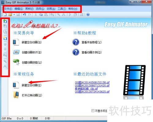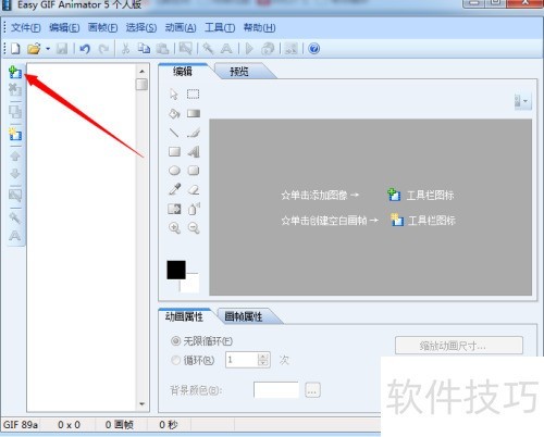 2、 Easy GIF Animator 的界面布局与常见软件相似,顶部为功能说明,左侧设有常用功能的快捷按钮,中央区域则是用于创作的主界面,即动画制作的舞台区域。