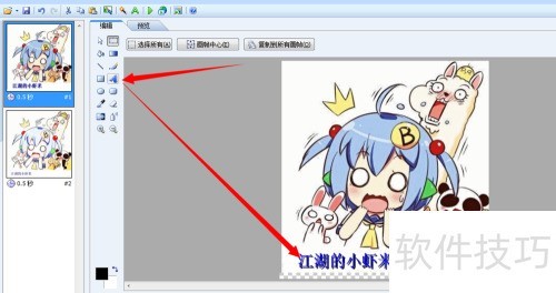 8、 与第六步相同,选取第二张图片,在文字工具图片上输入江湖的小虾米,并调整字体、颜色和大小。
