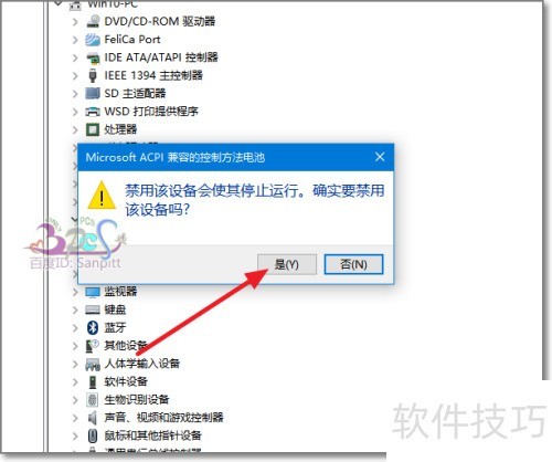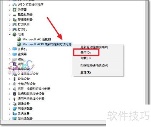 3、 找到电池下方的Microsoft ACPI兼容控制方法电池,右键点击并选择禁用即可。