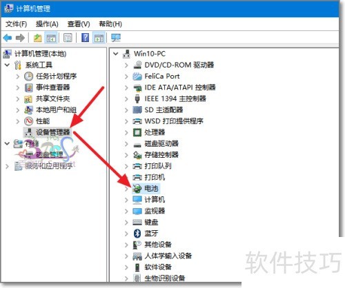 2、 打开设备管理器,右侧列表中选择电池选项。