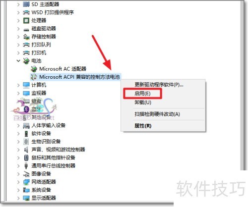 5、 右键点击Microsoft ACPI兼容的控制方法电池,然后选择启用该设备即可。