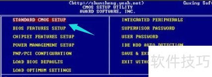9、 开机时出现提示画面后,按下DEL键进入CMOS设置界面。选择标准CMOS设置选项(具体名称可能因机型而异),按回车键进入配置页面。