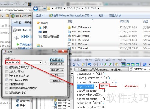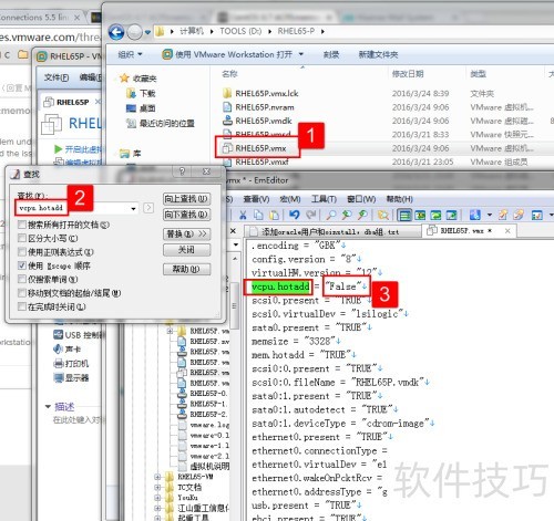 5、 修改虚拟机配置文件vmx,将mem.hotadd和vcpu.hotadd参数设为FALSE,可解决相关错误提示问题。